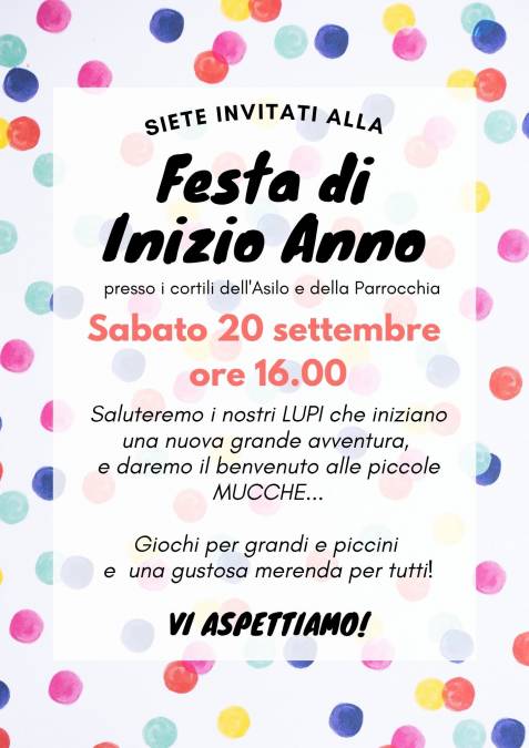 Sabato 20 settembre tutta la scuola festeggerà l'inizio del nuovo anno scolastico. Le famiglie insieme ai bambini e le insegnanti sono invitate dalle ore 16,00 presso gli spazi della scuola e il nido d'infanzia. Vi aspettiamo per giocare e fare merenda insieme, sarà l'occasione per salutare i Lupetti e dare il benvenuto alle piccole Mucche.
