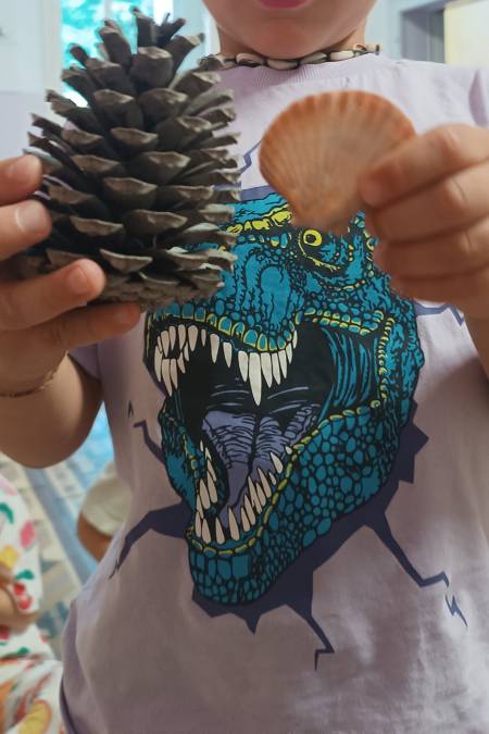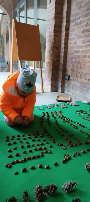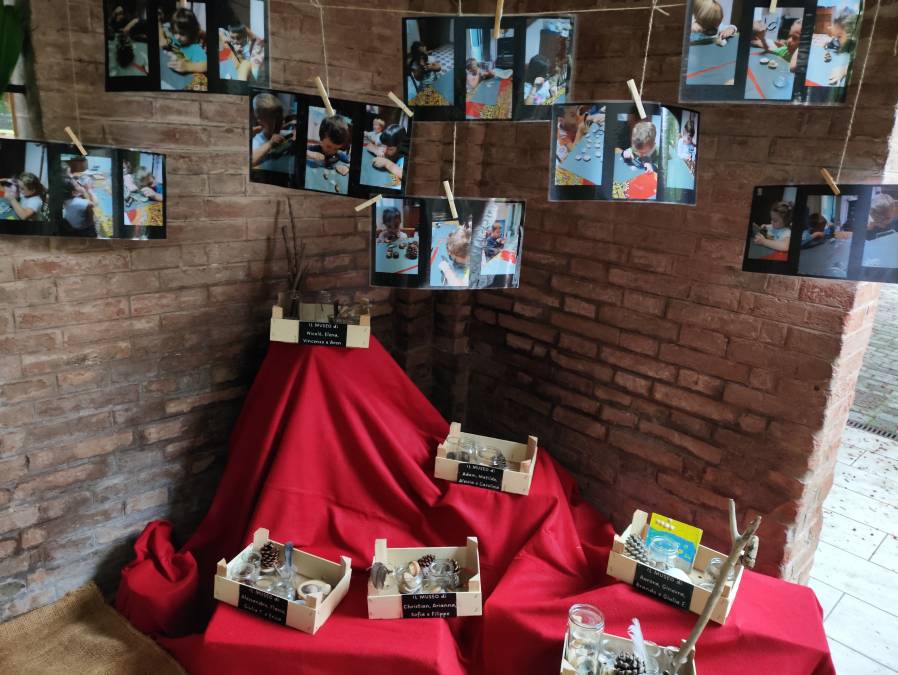 L’esperienza è cominciata con la raccolta di oggetti naturali: foglie, sassi, conchiglie, ramoscelli, ognuno scelto e custodito come un piccolo tesoro da rivestire di significato. Poi, come veri curatori di un museo, i bambini hanno imparato a classificare, catalogare, nominare e disporre gli elementi raccolti, scoprendo così il piacere dell’ordine e dell’osservazione. In questo modo, ogni gesto (scegliere, categorizzare, nominare) diventa un atto di conoscenza, dove il sapere prende forma attraverso il fare.