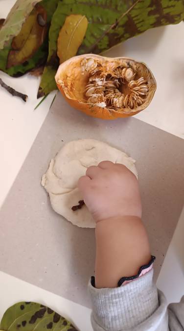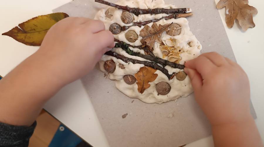 Abbiamo poi esplorato e manipolato gli altri elementi naturali raccolti nel corso delle nostre passeggiate, come frutti, semi, rametti, fiori secchi e sassolini: servendosi della pasta di sale come base della propria composizione, i bambini hanno potuto così scoprire ed esprimere il proprio linguaggio estetico, e al tempo stesso fare un esercizio di manipolazione fine.